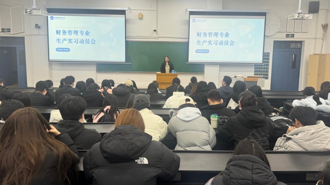 为全面提升学生的实践应用能力与综合素养,推动产教融合向深度化、高质量方向发展,搭建优质就业桥梁、夯实职业根基,财务管理专业与企盈(哈尔滨)财税服务有限公司达成深度合作,共建《生产实习》实践课程。为确保课程规范有序开展,明确目标与要求,专业于2025年11月13日在教二J201召开生产实习动员大会,会议由财务管理系副主任靳东主持,2023级全体财务管理专业学生参加。