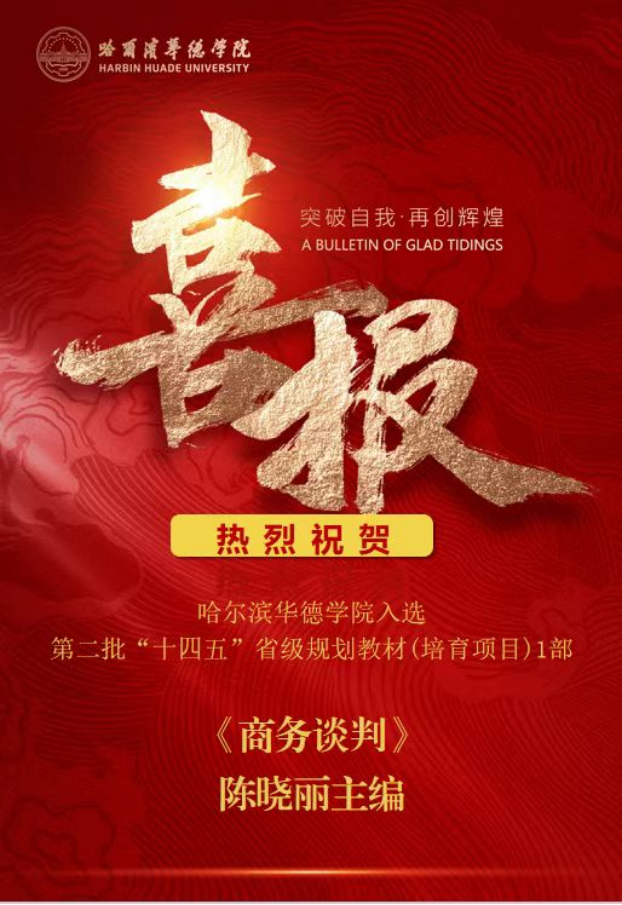 教材是立德树人的重要载体,是连接教育教学与用人需求的关键纽带。近日,黑龙江省教育厅正式公布了第二批“十四五”普通高等教育本科省级规划教材(含培育项目)认定名单,由哈尔滨华德学院经济管理学院陈晓丽副教授担任第一主编的教材《商务谈判》获批本科省级规划教材培育项目。此次入选,是学校在教材建设方面取得的一项标志性成果,充分彰显了学校在教育教学改革与专业内涵建设方面的成效。