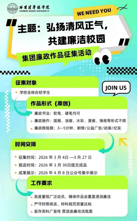 为积极响应集团关于院校廉政作品征集活动号召,深入推进我校廉洁文化建设,营造风清气正的校园育人环境,学科建设办公室、校团委、审计处联合开展校级廉政作品征集与评选工作,择优选拔优秀作品推报集团参评。现将具体事项通知如下: