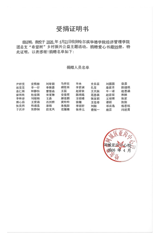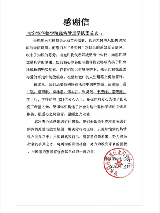 活动最后,哈尔滨市阿城区亚沟中心学校为学院送来受捐证明书与饱含深情的感谢信,这场公益活动在彼此传递的温暖中圆满收官。