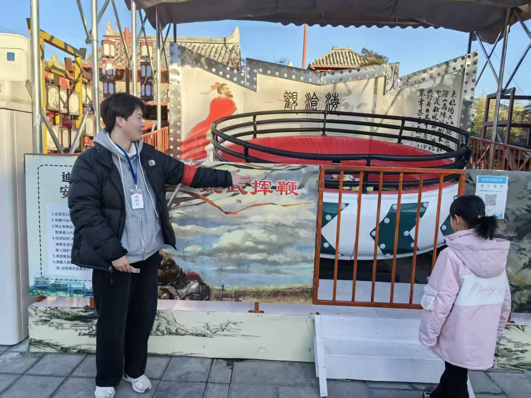 在政府古城景区,桑梓春晖队的安博文化身“文旅服务者”!他一边在游乐设施旁耐心引导游客、讲解安全规则,一边穿上红马甲清扫景区角落,让古建与美景保持整洁。从设施运维到环境守护,他用脚步丈量景区,用行动传递服务温度,在实践中读懂文旅服务的责任与意义。