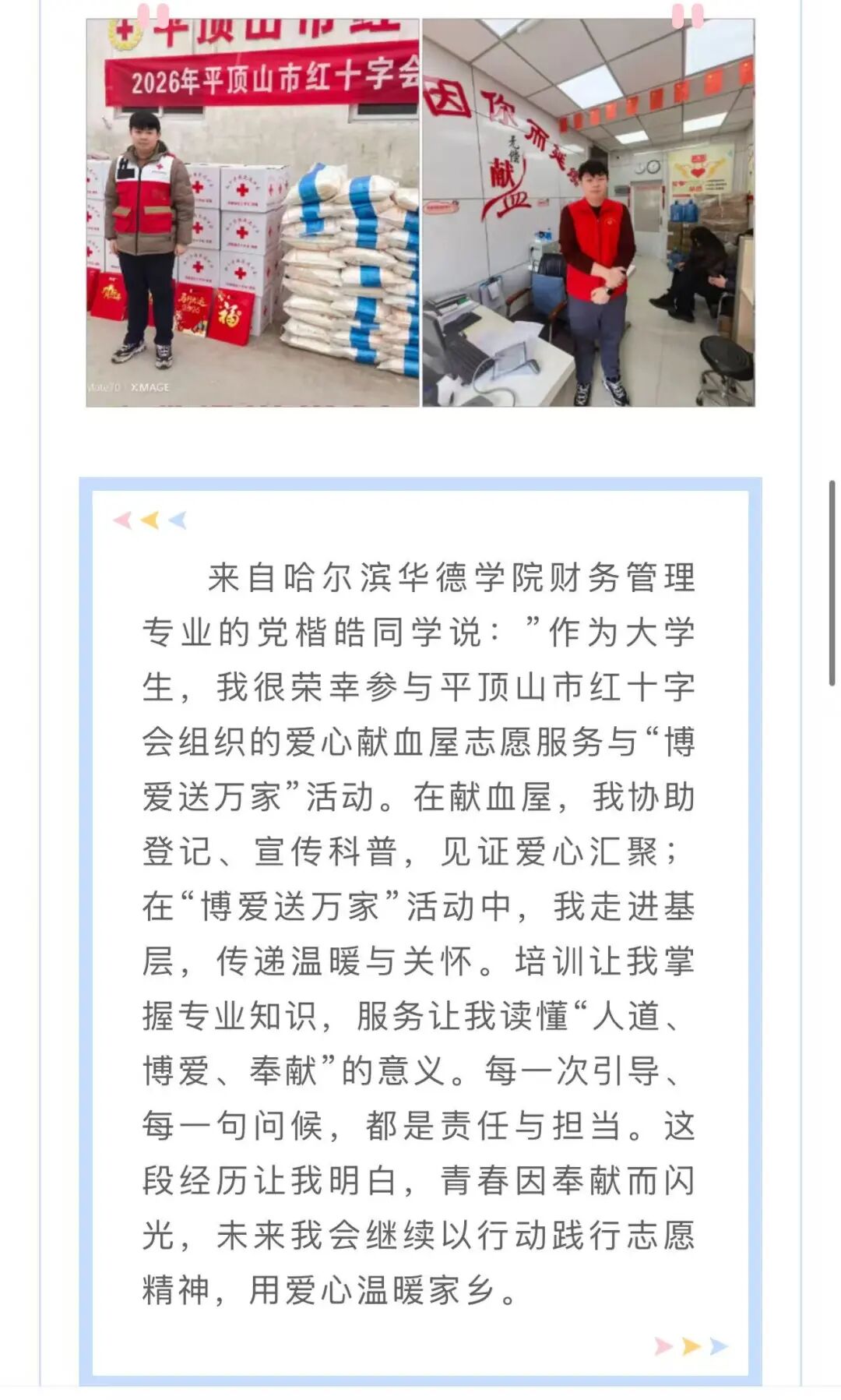 平顶山市红十字会报道我院2505504班党楷皓同学的无偿献血志愿服务。他坚守生命守护一线,以细致服务传递公益温度,用责任与坚守诠释青年对生命的敬畏与对社会的赤诚。