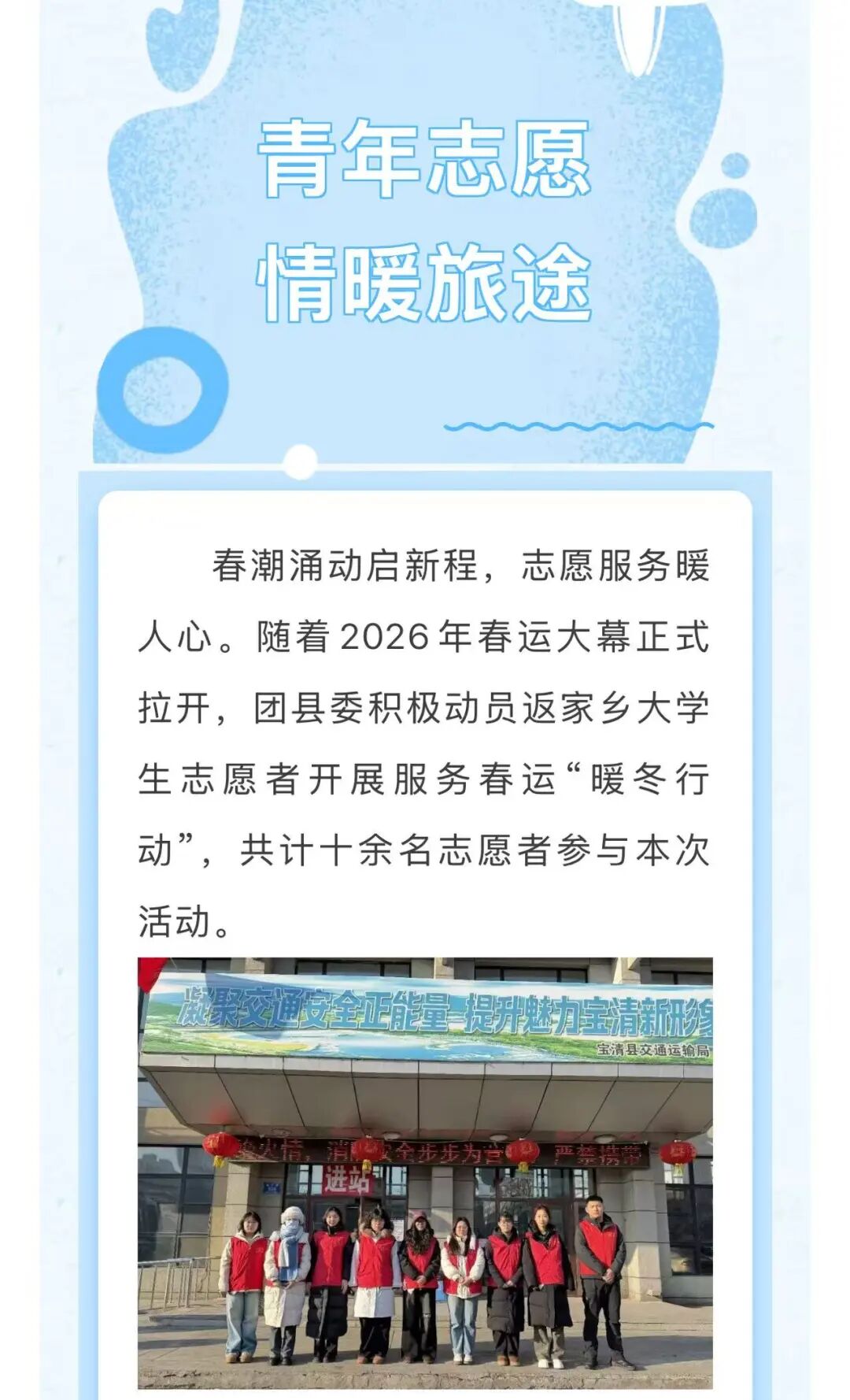 宝清共青团报道我院2505501班李久恩同学。她在宝清客运站开展志愿服务,负责游客引导、秩序维护、安检检票等工作,以坚守与耐心守护出行平安,展现青年风采。