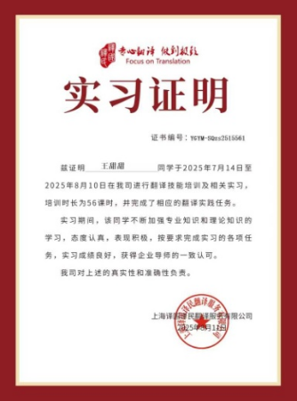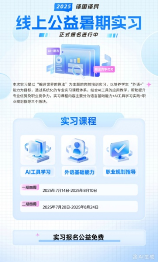 作为我校校企合作单位,译国译民集团是翻译、培训、图书出版、校企合作多业务并行发展的综合型公司,也是中国翻泽协会理事单位、全球五十强语言服务商、全国翻译专业学位研究生教育实习基地,旗下拥有译国译民翻译、译国译民教育、问才教育、译语康、必睿国际等核心子品牌。此次暑假线上实习项目自2025年7月14日持续到2025年8月24日,分两期进行。此外,译国译民集团还邀请了业界和学界的知名专家学者来为学生做直播分享,包括上海兰迪律所事务所合伙人胡莹律师的《从译员到律师:我如何看待英专生的职业可塑性?》、曾任人民日报社《环球时报》英文版首席记者杨升的《做国际新闻记者是一种什么体验?》、北京外国语大学李长栓教授的《“信达切”原则的翻译实战》、同济大学李梅教授的《技术传播:文科生的新赛道》、西门子医疗技术文档工程师张玫瑰的《英专生怎么做求职规划?听听学姐怎么说》、中国译协常务副会长黄友义的《有了AI,我们为什么还要学翻译?》。诸位业界和学界的知名专家学者为我校实习学生展示了语言行业的许多真实细节,丰富了学生对行业内各方面细分工作的了解。