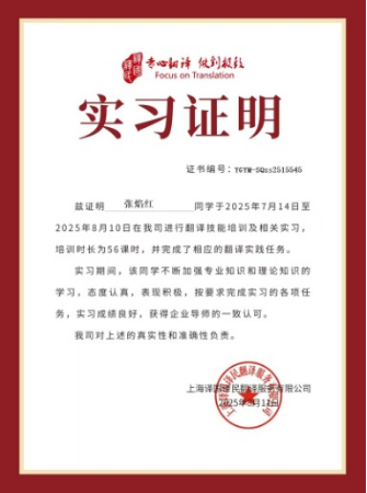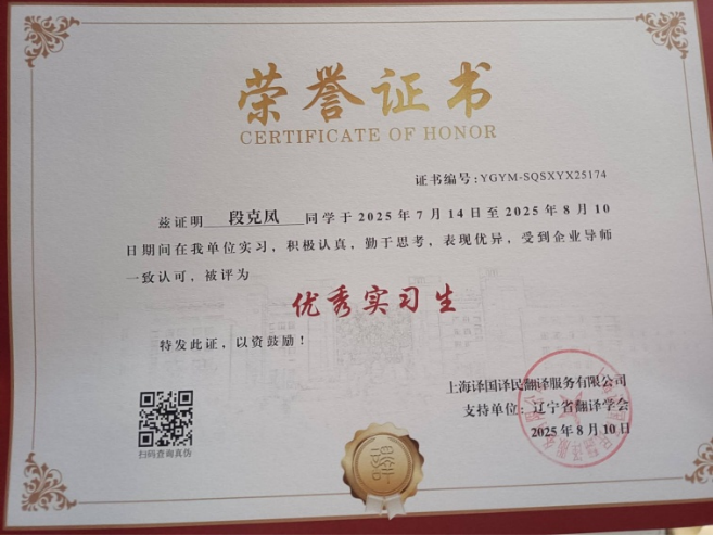 为进一步提升学生的实践能力和综合竞争力,我校经济管理学院英语专业特积极组织学生参与由译国译民集团主办的“2025年暑假线上实习”项目,为学生提供了接触前沿翻译技术和行业实践的机会。通过参与该项目,帮助学生正确认识AI技术的工具属性,掌握智能时代语言服务新技能,深化对现代语言行业的认知,有效弥补在校学习与行业实践之间的差距。英语专业共有36位学生参与此次为期4周的线上实习项目,1位老师被评为优秀指导教师,1位学生被评为优秀实习生。