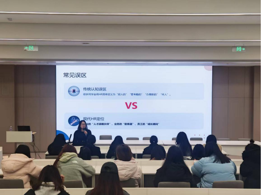讲座伊始,宋鸿老师并未直接进入理论讲解,而是以一个生动有趣的“开场问”迅速吸引全场注意力,巧妙打破了同学们对HR“只管考勤、专办离职的‘坏人’”这一传统认知误区。随后,宋老师结合自身十六年的HR从业经验与行业洞察,清晰阐释了现代HR的核心价值——“始于信任、成于专业、终于价值”。她指出,新时代的HR早已不是简单的行政辅助角色,而是企业人才战略的参与者、组织发展的推动者,要拥有良好的沟通协调能力与同理心,才能真正为企业吸引、留住并培养核心人才。这番深入浅出的讲解,不仅让同学们对HR职业有了全新的认知,也为大家未来的专业学习与职业规划指明了方向,为整场讲座奠定了专业且富有启发性的基调。