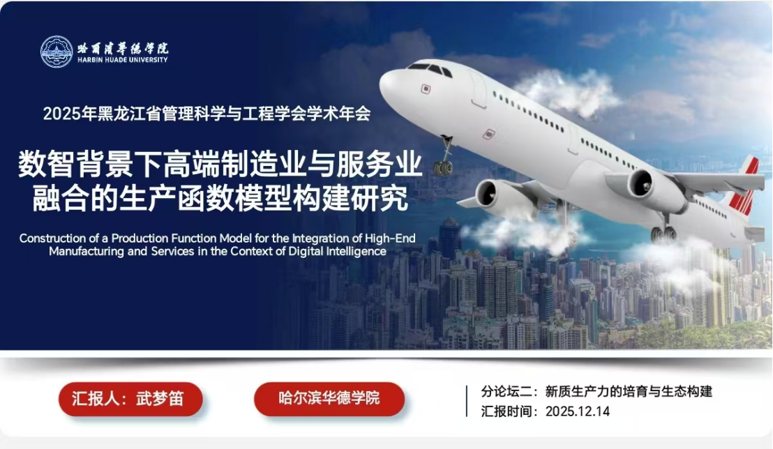 本次会议聚焦AI时代的管理理论创新、产业转型升级、数智融合发展等关键议题,涵盖AI赋能的技术创新、供应链管理、组织变革、产业生态构建等十余个前沿方向。会议邀请了哈尔滨工业大学、哈尔滨工程大学、东北林业大学等多所高校的知名学者作主旨报告,并设有院长论坛、学术分论坛、期刊交流等多种形式的研讨环节,为学界与业界搭建了高质量的对话平台。经济管理类学院教师武梦笛在大会“新质生产力的培育与生态构建”分论坛上,作了题为《数智背景下高端制造业与服务业融合的生产函数模型构建研究》的学术报告,其前沿的研究视角与扎实的理论构建受到与会专家的高度认可。