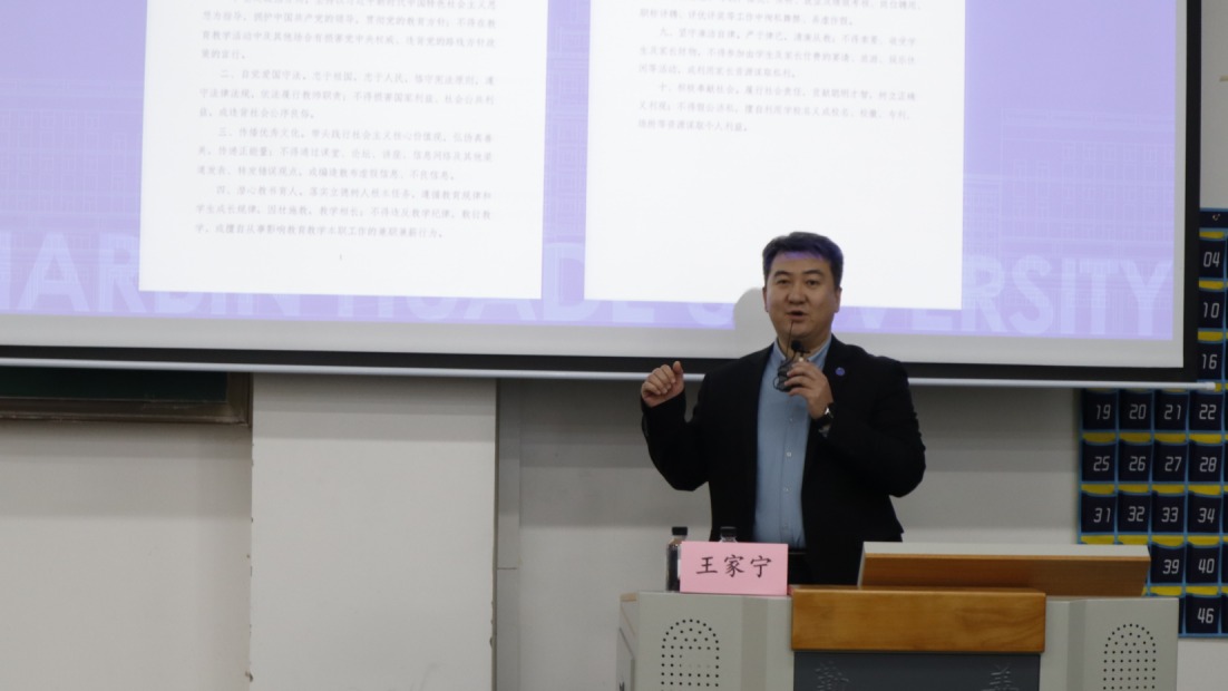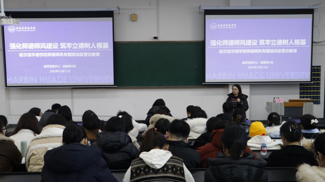 为深入贯彻落实新时代高校教师职业行为准则,推动师德师风建设常态化、长效化,2025年12月11日下午,哈尔滨华德学院经济管理学院在教一201举行师德师风专题培训会议。本次会议由教务处副处长王家宁、监察审计处纪律监察主管孙一鸣主讲,经济管理学院院长李迪、副院长李娟、学发中心主任孙宇锋及全体无课教师参加会议。