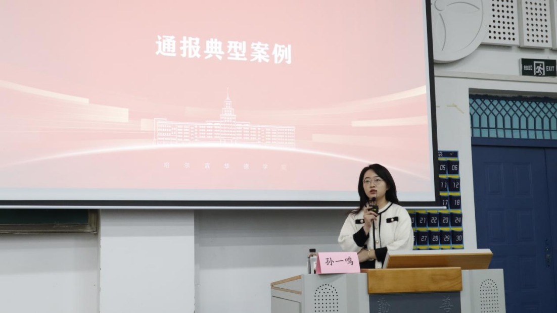 随后,监察审计处纪律监察主管孙一鸣结合近期教育系统发生的真实案例,开展了师德师风警示教育。她通过剖析招聘徇私、工作失职、言行失范、采购违规、招投标舞弊、师生交往越界等七类典型案例,深入浅出地揭示了个别教职工在纪律意识、程序观念、职业操守等方面存在的问题极其严重后果。孙一鸣指出,这些案例警示我们,师德底线不容触碰,制度红线不可逾越。她要求全体教职工以案为鉴,时刻自重、自省、自警、自励,严守职业规范,强化廉洁意识,做到知敬畏、存戒惧、守底线。
