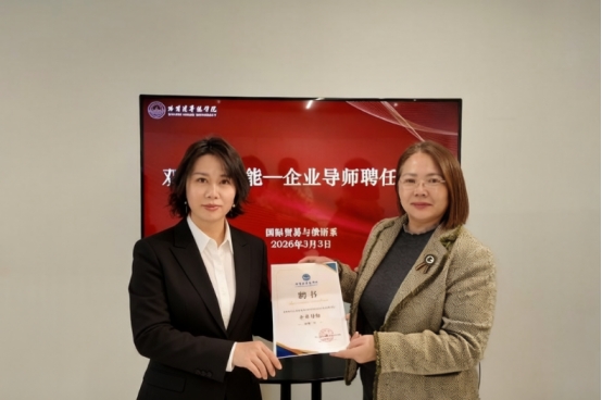 会议第二环节举行企业导师聘任仪式。为进一步强化实践育人环节,构建校内专业导师与企业实战导师协同育人机制,经济管理学院正式聘请范丹经理担任国际经济与贸易专业企业导师。国际贸易与俄语系主任刘永芝为范丹经理颁发企业导师聘书。此举标志着校企“双导师”育人机制持续深化,为学生实习实训、职业规划、就业指导提供了有力支撑。