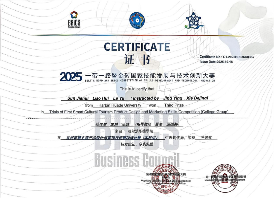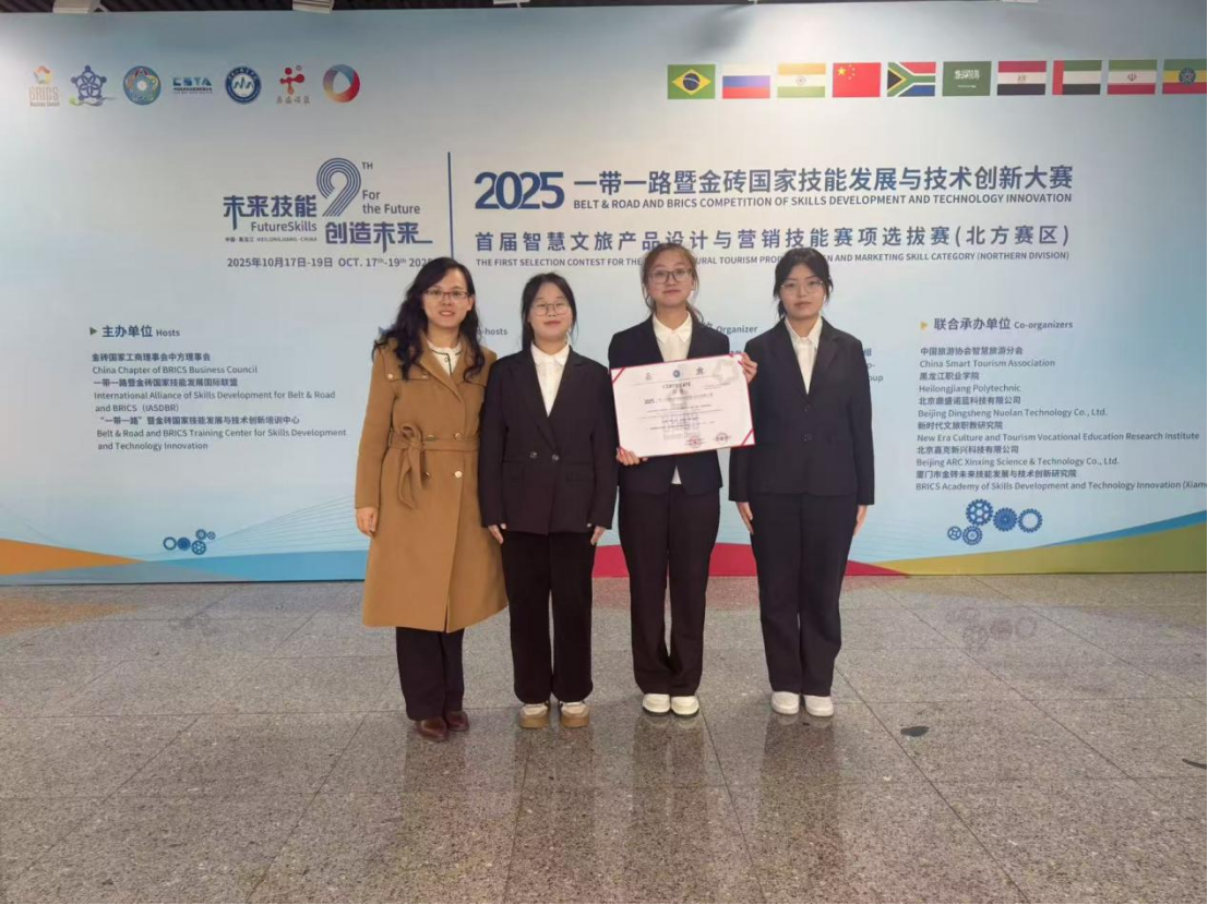 近日,2025一带一路暨金砖国家技能发展与技术创新大赛首届智慧文旅产品设计与营销技能赛项北方赛区选拔赛在黑龙江职业学院落下帷幕。我校经济管理学院英语系学生团队在指导教师的全程指导下,凭借《候鸟E站・宠旅相伴》项目方案,从众多参赛队伍中脱颖而出,荣获三等奖,展现了英语专业学子在跨学科实践中的亮眼实力,也彰显了师生协同育人的显著成效。