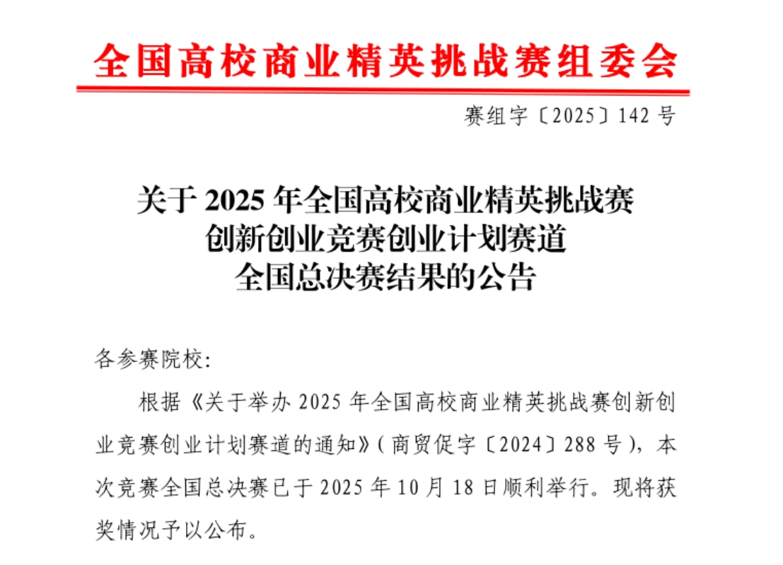 10月18日,2025年全国高校商业精英挑战赛创新创业竞赛创业计划赛道全国总决赛顺利举行。本届竞赛共有来自全国各地的31个省、自治区、直辖市的600余所高等院校报名参赛。全国总决赛环节采用分组评比的方式,经过激烈比拼,我院参赛队伍获得全国总决赛二等奖4项、三等奖2项的优异成绩。