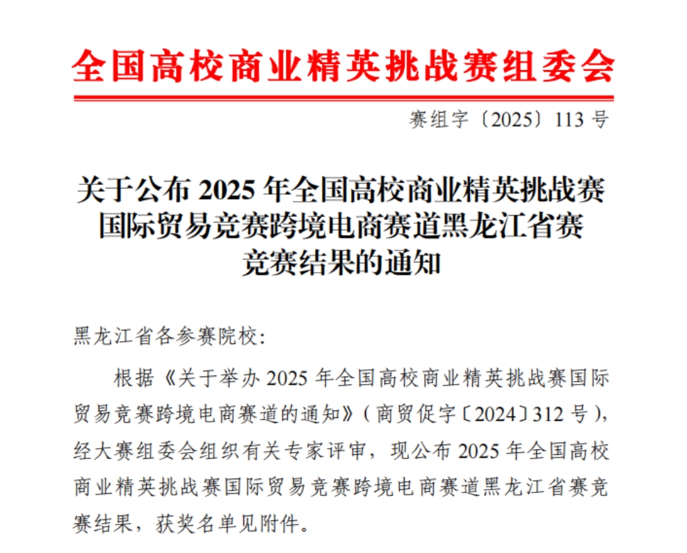 2025年9月20日,2025年全国高校商业精英挑战赛国际贸易竞赛跨境电商赛道黑龙江省总决赛落下帷幕,经济管理学院参赛团队取得黑龙江省级一等奖一项,二等奖一项,三等奖六项。全国高校商业精英挑战赛国际贸易竞赛是由中国国际贸易促进委员会商业行业委员会、中国国际商会商业行业商会和中国商业经济学会联合主办,中国国际贸易促进委员会商业行业委员会承办的国家级学科竞赛活动,已连续三年入选中国高等教育学会发布的学科竞赛排行榜目录,是我国国际经贸教育领域参与广泛、影响力深远的品牌赛事,为高校学子搭建了跨专业综合实训与创新实践的优质平台。