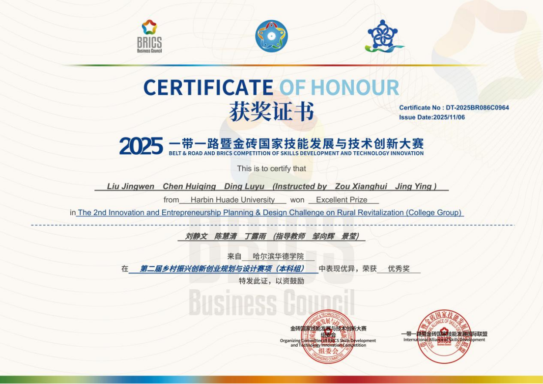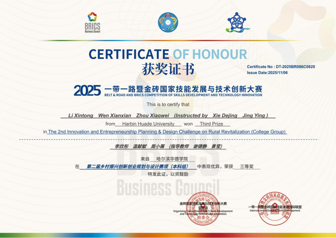 近日,2025一带一路暨金砖国家技能发展与技术创新大赛第二届乡村振兴创新创业规划与设计竞赛中部地区选拔赛圆满落幕。经济管理学院三支参赛团队凭借扎实的专业素养与创新的跨学科方案,从全国多所院校的参赛队伍中脱颖而出,共获区域赛三等奖1项、优秀奖2项,充分展现了学院在乡村振兴复合型人才培养方面的显著成效。