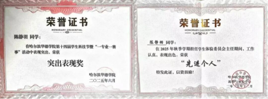 在深耕学业、竞逐赛场的同时,陈静羽积极投身校园工作,以多重身份践行实干担当,将个人能力转化为服务校园、带动同学的实际力量,先后获评“突出表现奖”“先进个人”等荣誉称号。