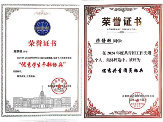 陈静羽始终牢记新时代大学生的责任与使命,先后参与哈尔滨大剧院志愿者,哈尔滨马拉松志愿者,学校禁烟志愿者等志愿活动,将社会实践和志愿服务作为实现自我价值、回馈社会的重要途径,用点滴行动传递温暖,践行青年担当。