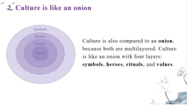 在《跨文化商务交际》第一单元culture的教学中,景莹老师以文化模型为载体设计实操任务,让学生自主选择冰川模型或洋葱模型绘制故宫的文化模型,以此深化对文化内涵的理解。为保障任务完成质量,她明确要求学生基于模型的介绍需具备关联性和一致性,如选用洋葱模型的学生,若选定等级制度为核心价值观,其介绍的仪式、英雄、符号等内容均需围绕该价值观展开。同时,景莹老师还提供图片绘制样例作为参考,为学生搭建学习支架,降低实操难度,引导学生系统梳理文化要素之间的内在联系。