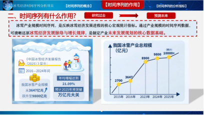金文雯老师结合自身深耕SC教学改革的实践经验及冰雪经济产业发展现状,介绍了该课程的整体设计思路与实施路径,全面展示了时间序列分析方法与冰雪经济场景、AI技术深度融合的具体内容。该课程立足《统计学》核心课程基础,紧扣SC教学改革“以学生为中心、以能力为导向”的核心要求,结合我国冰雪产业规模持续增长、冰雪旅游人次稳步提升的行业背景,以万科松花湖滑雪场经营数据、哈尔滨冰雪大世界游客量等真实案例为依托,重构课程内容体系,将抽象的时间序列分析理论与冰雪经济实操场景紧密结合,创新破解了传统统计类课程公式繁杂、案例抽象、学生参与度不高、学用脱节的突出难题,实现了专业知识与区域产业需求的精准对接。